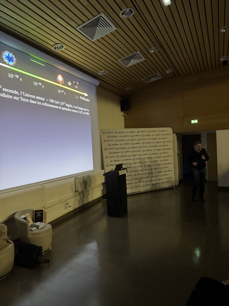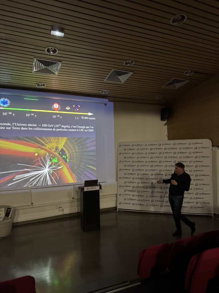 Les étudiants d’ECT1 ont eu le privilège d’assister hier soir à une conférence du physicien Yann Mambrini (CNRS, ENS Paris) qui nous a invités à un voyage dans le cosmos et dans le temps pour mieux comprendre l’histoire de l’Univers depuis sa formation il y a 13,8 milliards d’années et son évolution probable pour les 8 milliards d’années à venir selon les recherches actuelles.