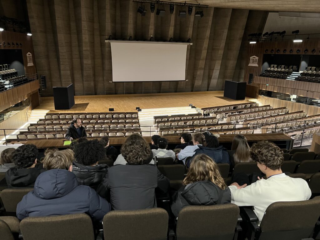 Les Ă©lĂšves de TA ont participĂ© Ă une visite guidĂ©e de lâUNESCO, autour du thĂšme du multilatĂ©ralisme, de son fonctionnement et de ses enjeux dans un monde en constante Ă©volution.